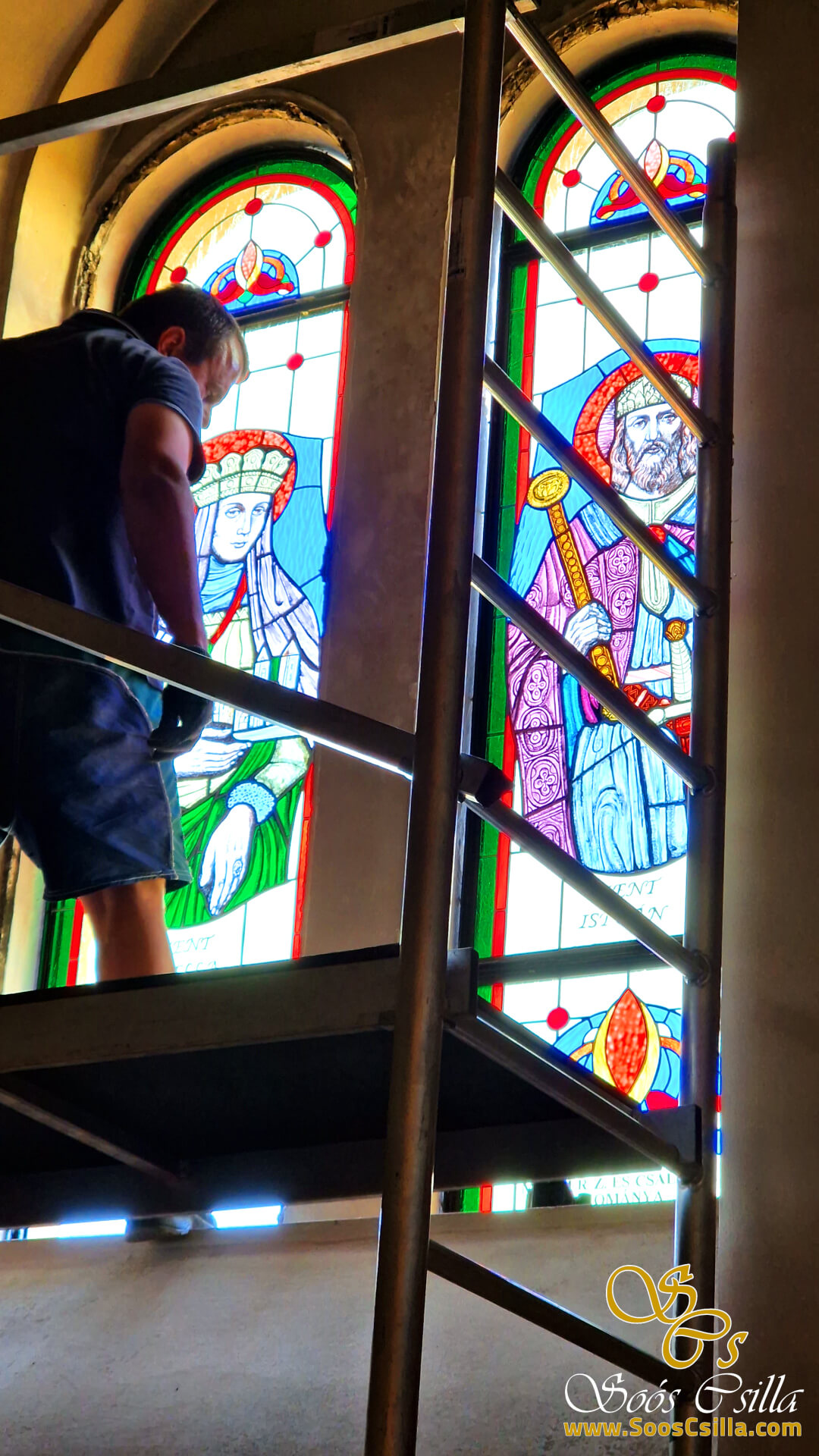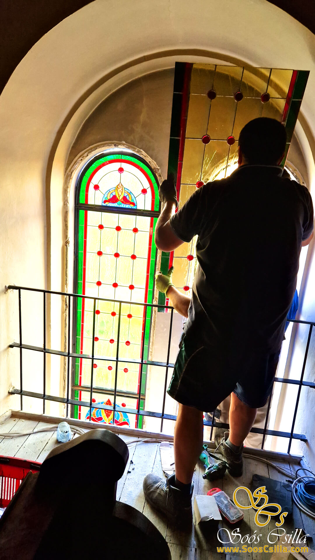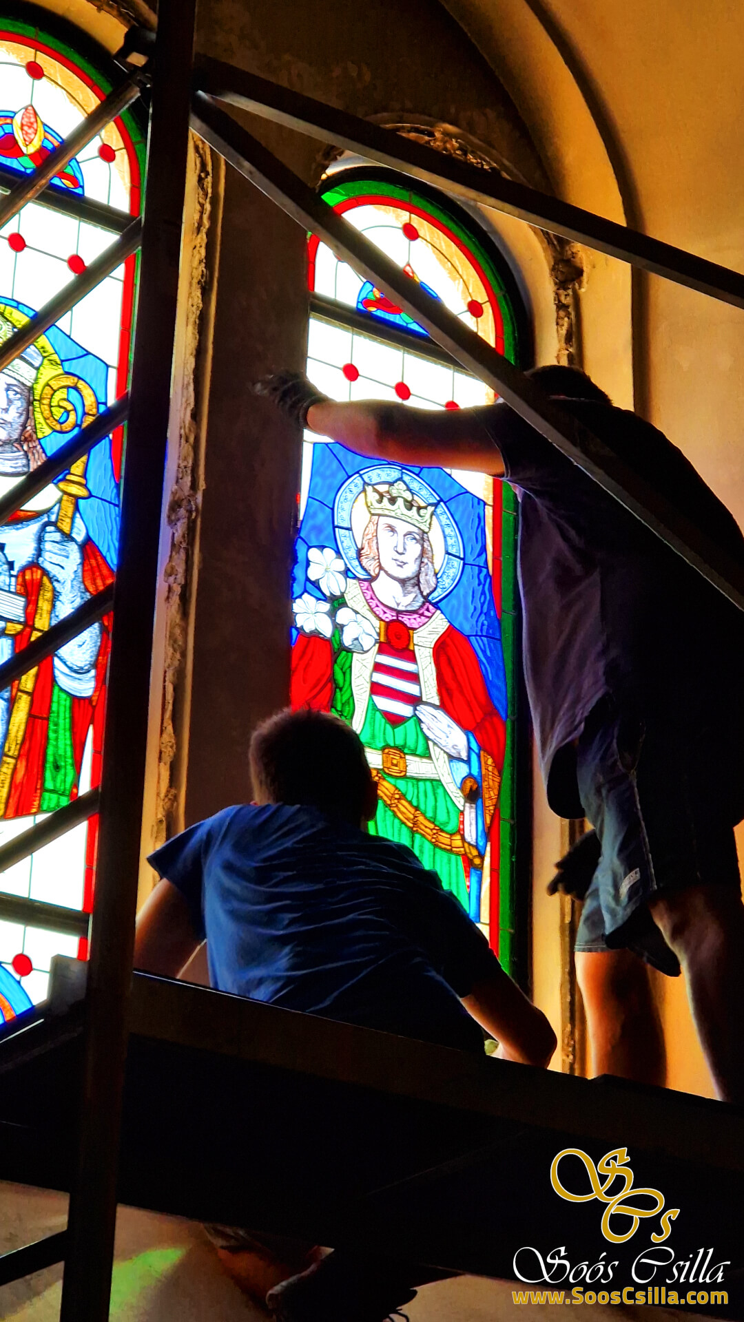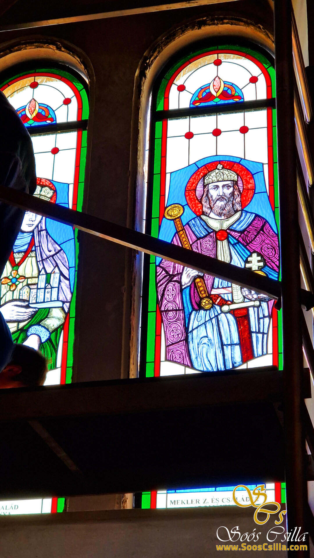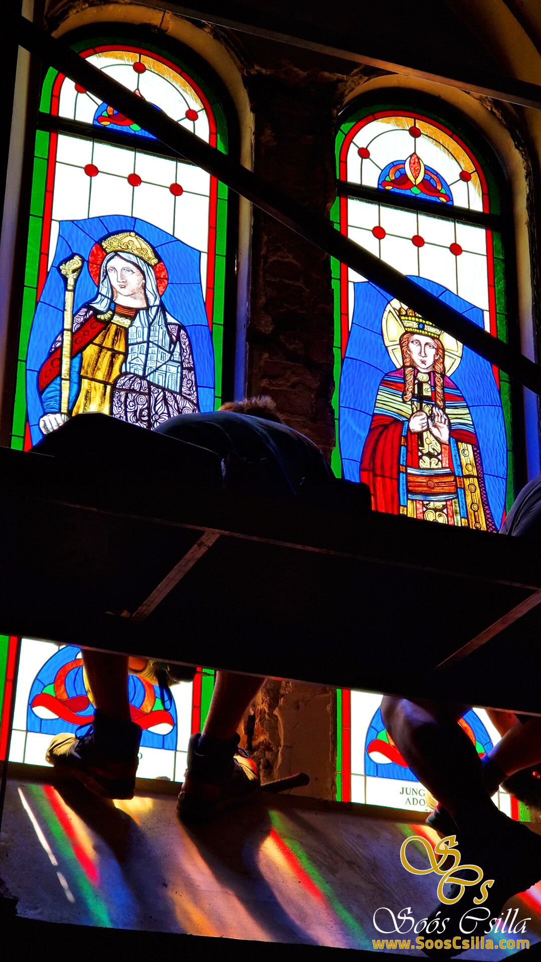 Galéria ukazuje proces inštalácie vitráží kostola Szent László vo Vespréme. Na inštaláciu okien tejto veľkosti je zvyčajne potrebné lešenie, pretože kostolné okná sú dosť vysoko od zeme. Na vitrážach vidno svätú Kingu, svätú Pirosku, svätú Gellért, svätú Imre, svätú Gizella a svätú István.