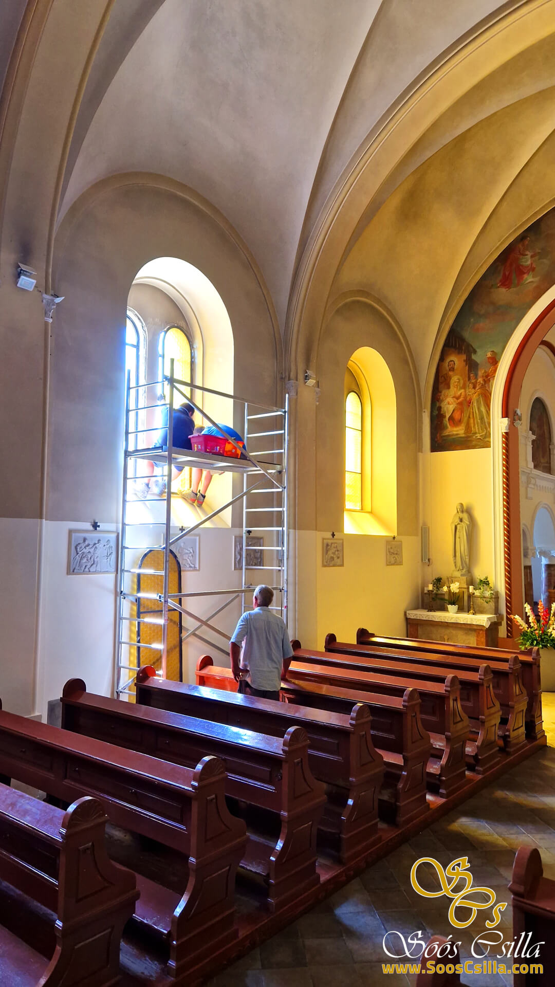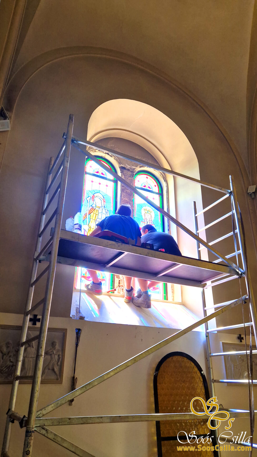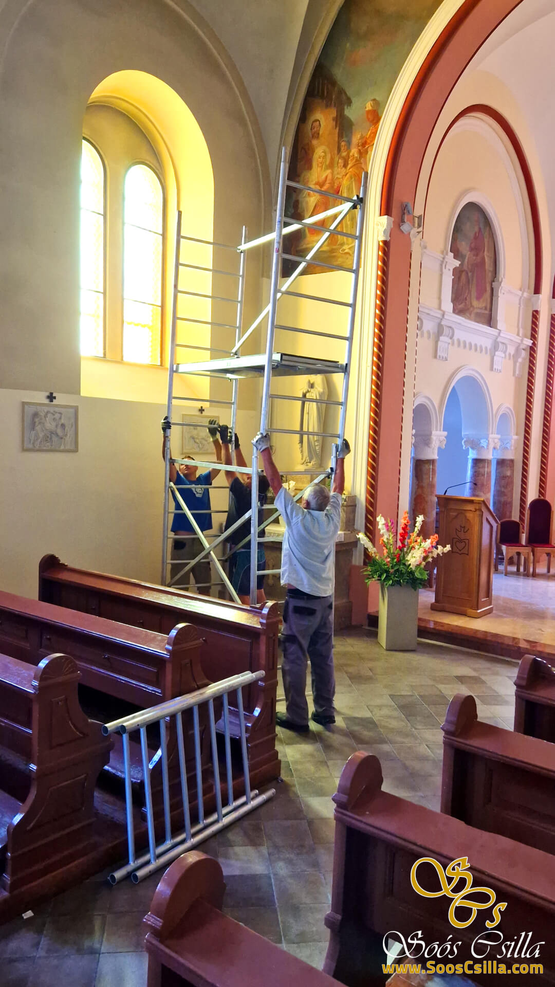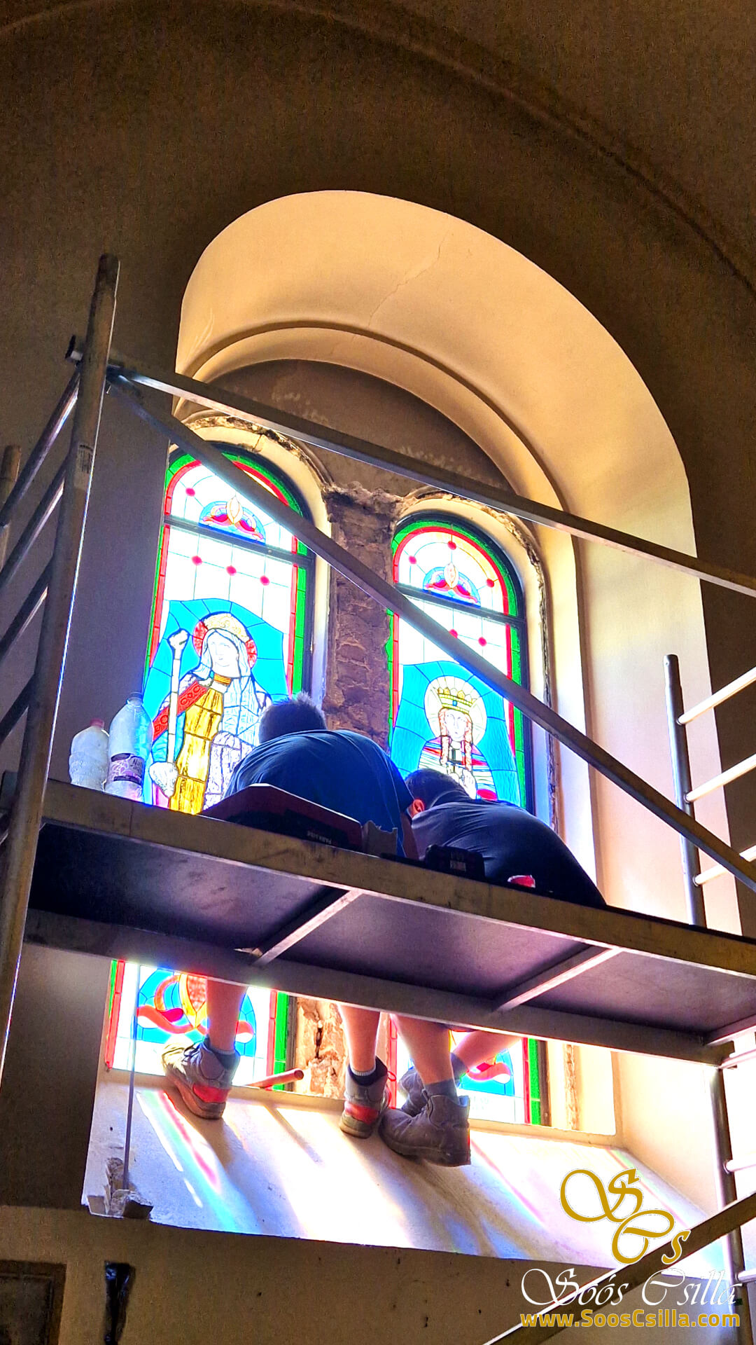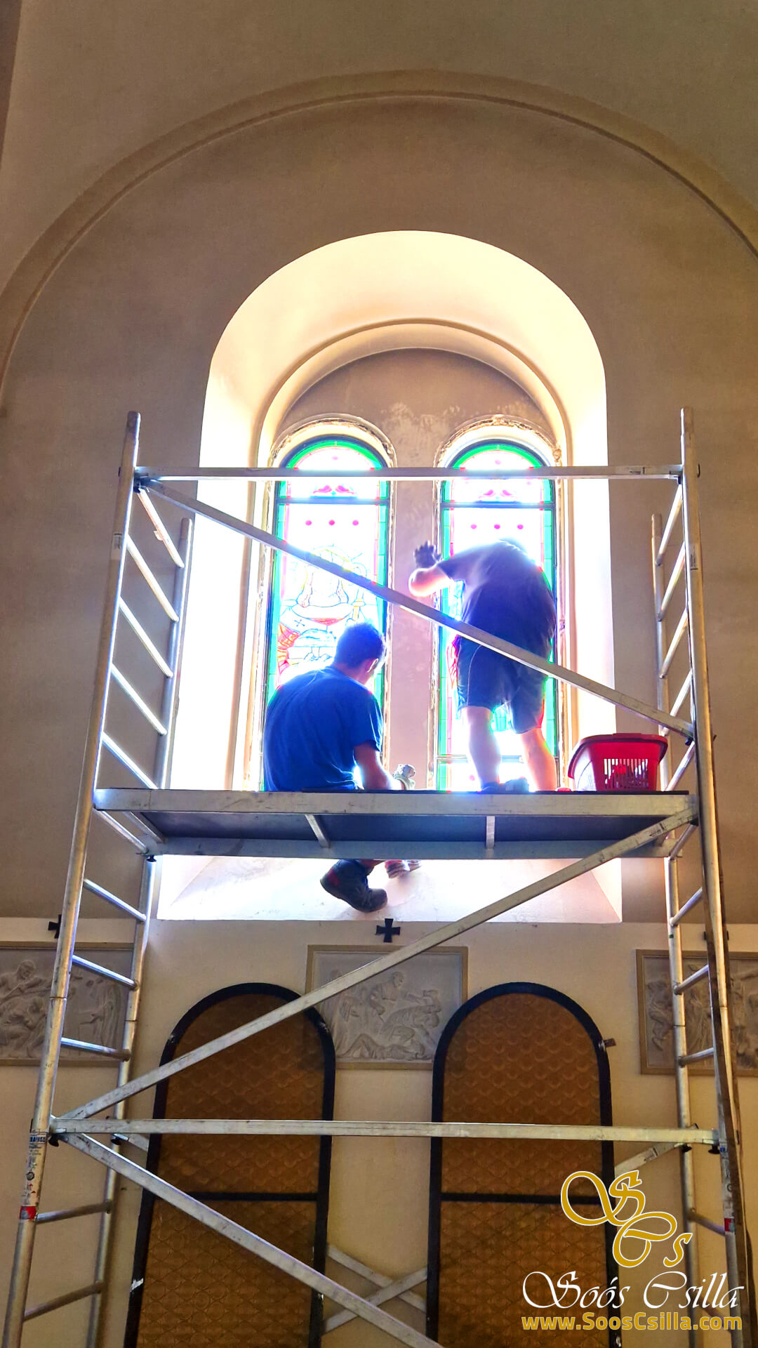 Galéria ukazuje proces inštalácie vitráží kostola Szent László vo Vespréme. Na inštaláciu okien tejto veľkosti je zvyčajne potrebné lešenie, pretože kostolné okná sú dosť vysoko od zeme. Na vitrážach vidno svätú Kingu, svätú Pirosku, svätú Gellért, svätú Imre, svätú Gizella a svätú István.
