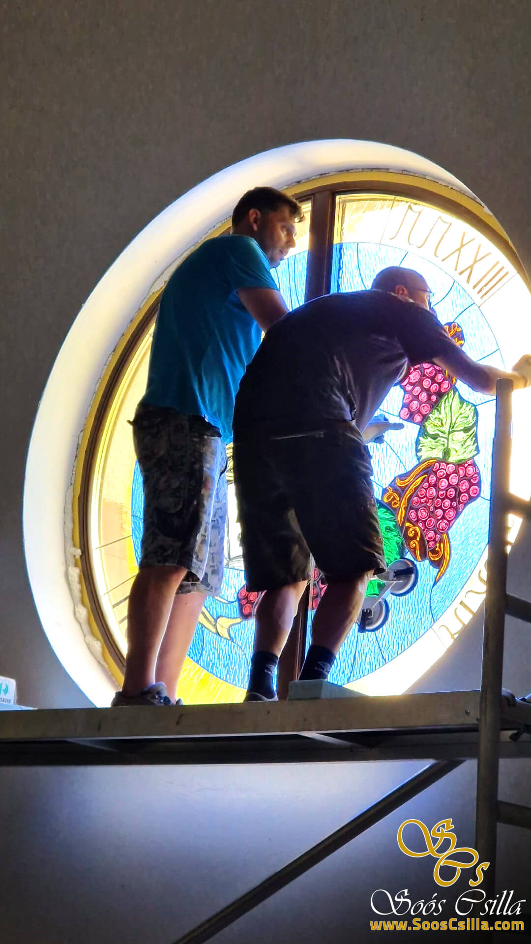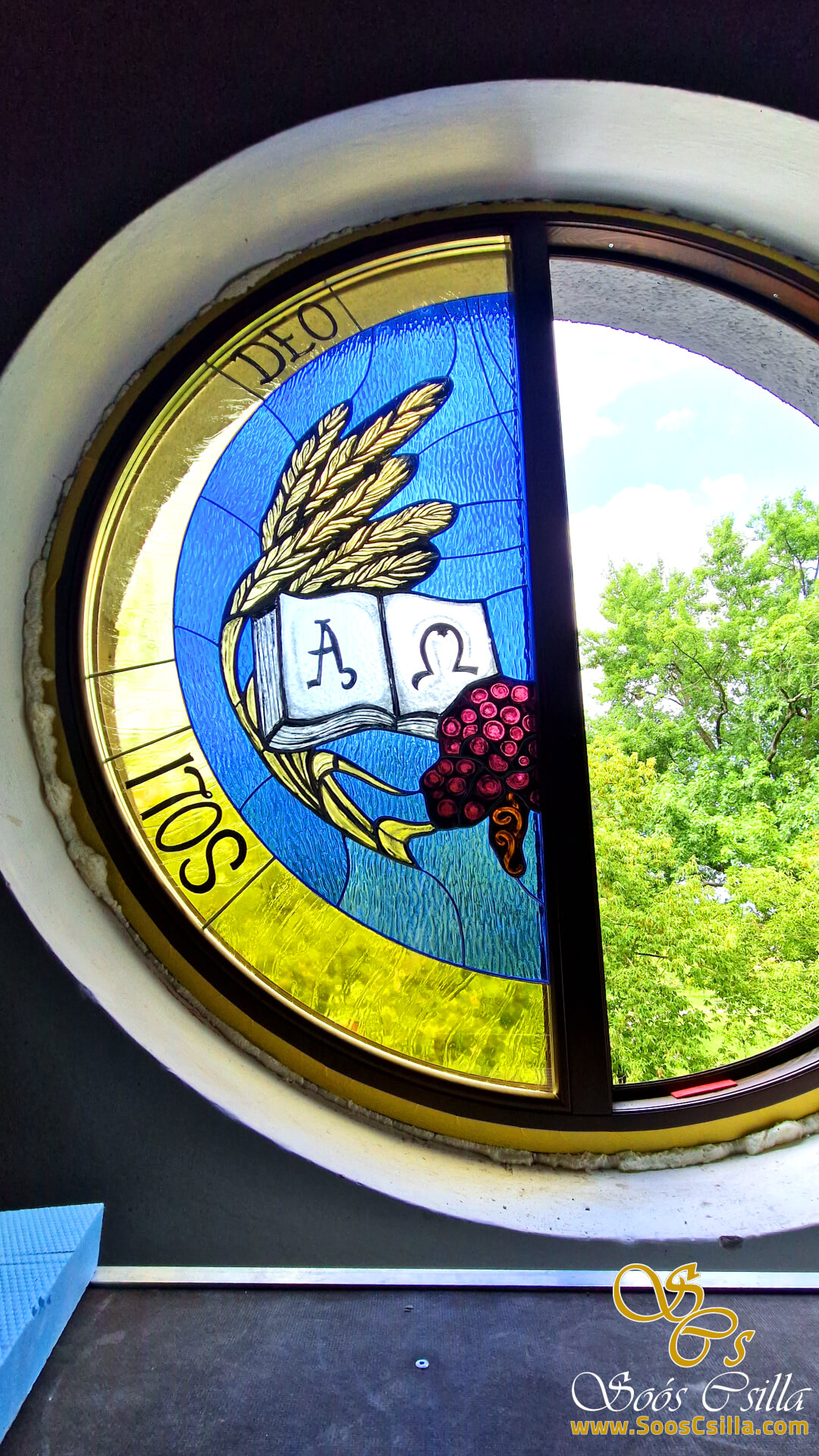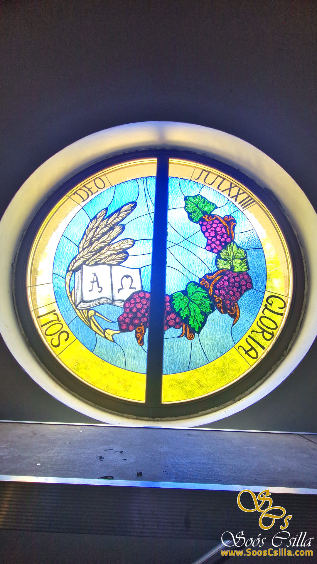 Počas jeho inštalácie a v hotovom stave je možné vidieť kruhové okno s priemerom 2 metre. Zobrazuje vinicu a Bibliu s pšeničnými klasmi. Táto vitráž je ozdobou okna reformovaného kostola.
