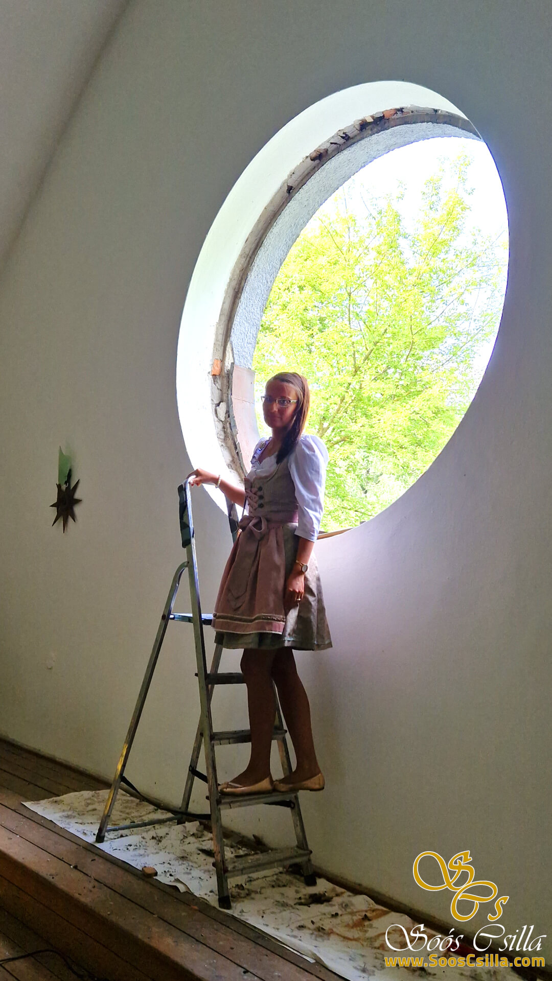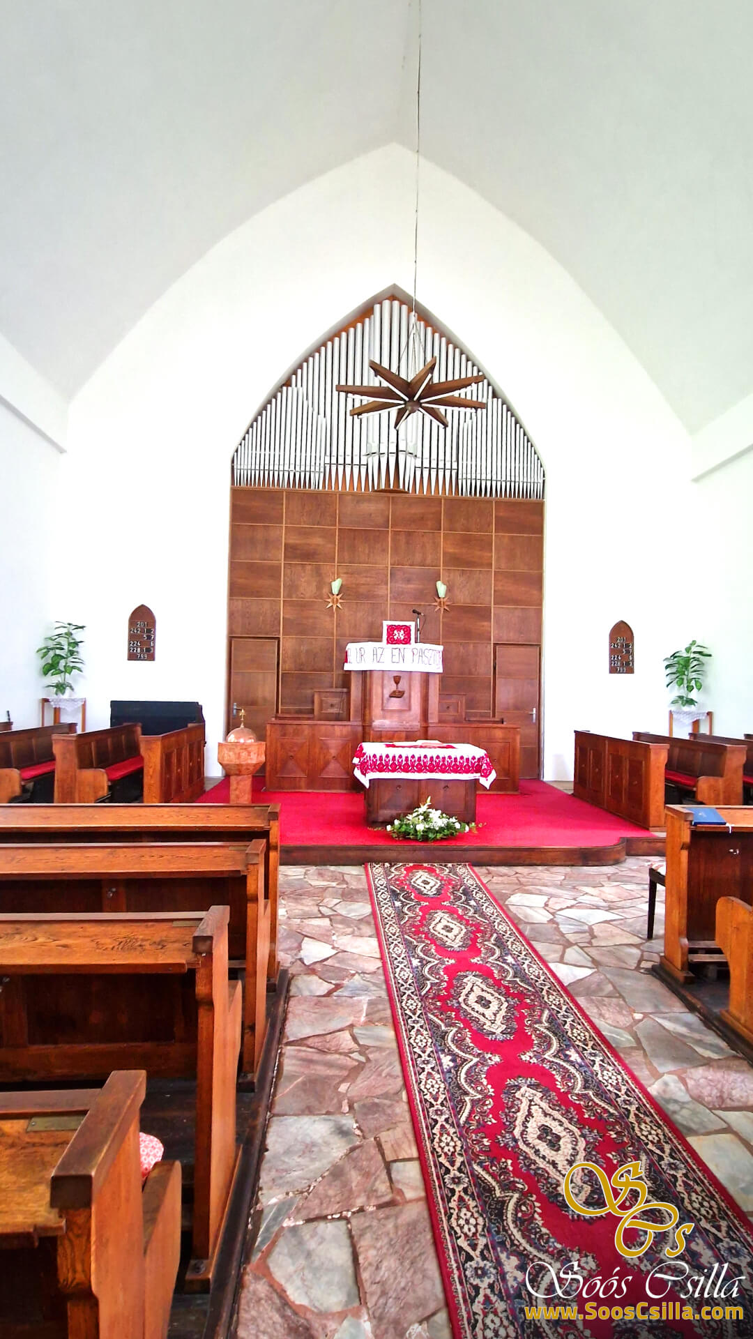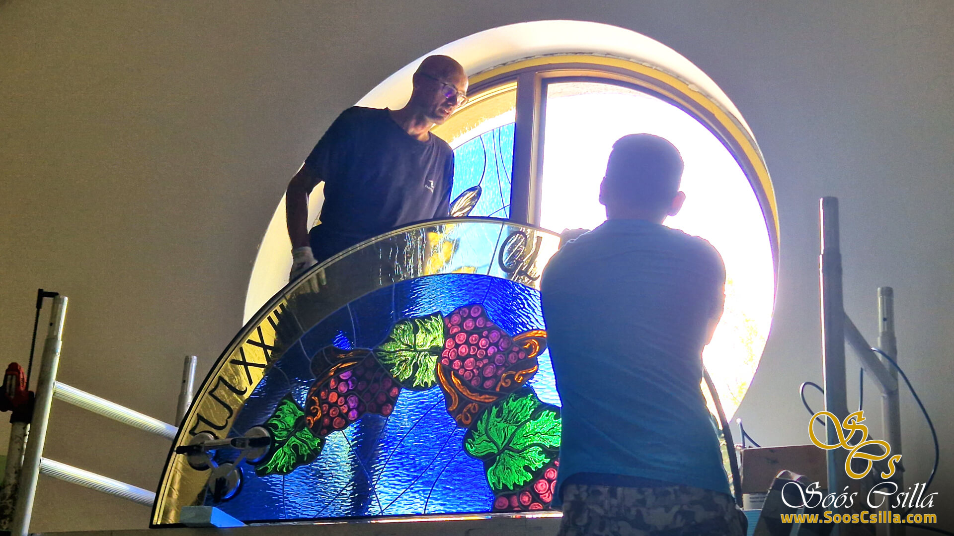 Počas jeho inštalácie a v hotovom stave je možné vidieť kruhové okno s priemerom 2 metre. Zobrazuje vinicu a Bibliu s pšeničnými klasmi. Táto vitráž je ozdobou okna reformovaného kostola.